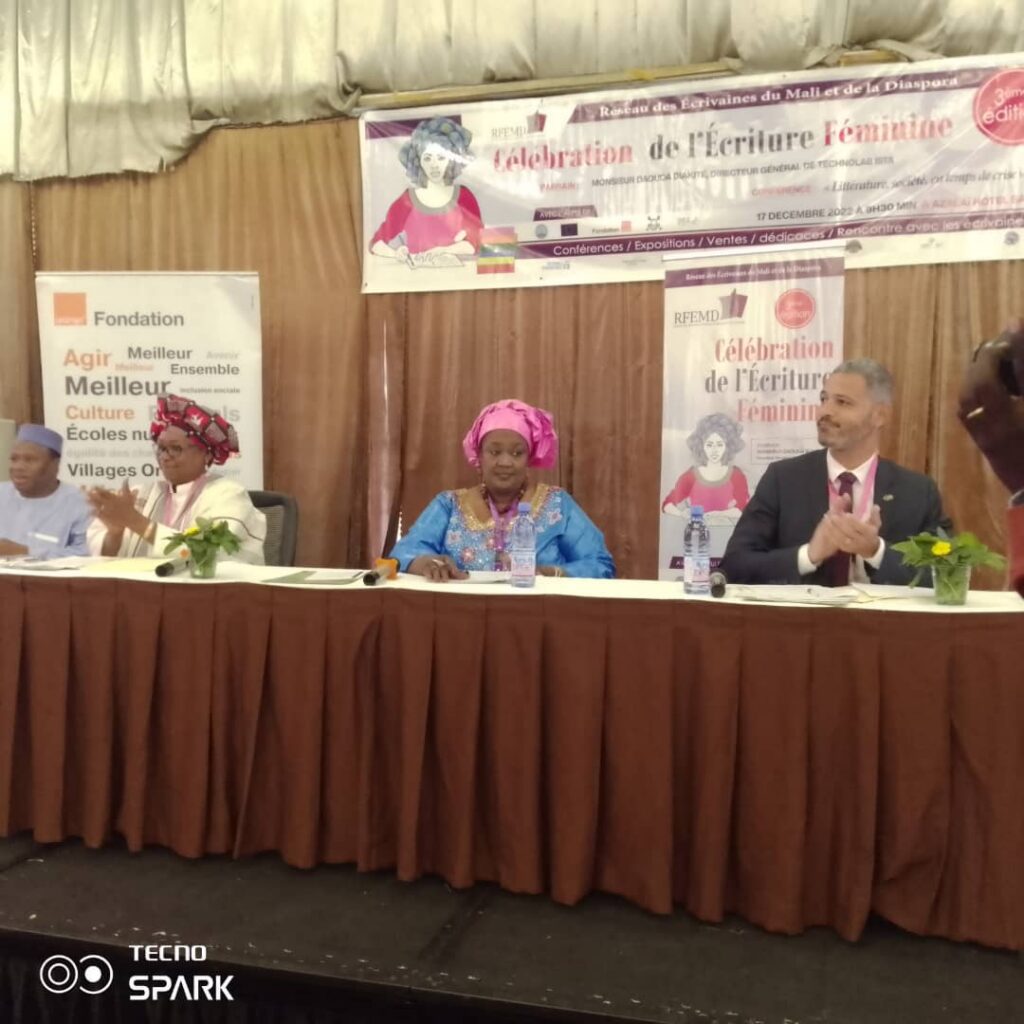 Le RFEMD combat pour la sortie de la jeune génération de l’ombreLa représentante du ministre de l’Artisanat de la Culture de l’Industrie Hôtelière et du Tourisme, Mme Diarra Mariatou Coulibaly a présidé les activités de la 3ème édition de la célébration de l’écriture féminine sous le thème : « Littérature, société en temps de crise », du Réseau des Femmes Ecrivaines du Mali et de la Diaspora (RFEMD). C’était samedi 17 novembre 2022, à l’Hôtel Azalaï Salam, en présence du Parrain M. Daouda Diakité, Directeur général de TECHNOLAB-ISTA ; de Philippe Lafosse, Conseiller des Affaires Politiques, représentant l’Union Européenne ; Mme Diarra Oumou Armand Sangaré, Présidente du RFEMD ; entre autres.Au cours de son intervention la Présidente du Réseau des Femmes Ecrivaines du Mali et de la Diaspora (RFEMD), Mme Diarra Oumou Armand Sangaré a rappelé que le thème choisi cette année est lié à leur perspective de la crise dans la société. Selon elle, une thématique qui incite à réfléchir sur leur environnement et leur condition socioculturelle, sur comment la traduire au plan linguistique a fait éveiller leur conscience sur la voie à suivre.Elle dira que le RFEMD a toujours mit l’accent sur le renforcement de la solidarité, l’entraide et l’entente entre ses membres : « unie par excellence par la littérature ».A l’en croire : « d’octobre 2019 à nos jours, nous œuvrons pour la mise en place d’une politique d’insertion des jeunes et des femmes à travers la promotion de leurs œuvres littéraires. Notre combat doit permettre à la jeune génération de sortir de l’ombre, de réaliser des projets autour du livre ».Pour elle, le thème choisi : « Littérature, société en temps de crise » s’inscrit en droite ligne avec les difficultés rencontrées par le RFEMD, les éditeurs et livreurs avec la pandémie de la Covid-19, l’embargo et le coût galopant du papier. Avant de solliciter l’accompagnement des autorités du pays par une attention particulière à l’endroit des femmes écrivaines.Le parrain M. Daouda Diakité, Directeur général de Technolab-Ista a remercié les femmes écrivaines du RFEMD, qui à travers leurs œuvres : dans le temps et l’espace, les fougues de la jeunesse n’ont réussi à se limiter souvent dans des d’horizons lointains, la dynamique qu’elles sont en train de poursuivre. Il a réitéré son soutien et son accompagnement audit réseau.Le représentant de l’Union Européenne, Philippe Lafosse, après avoir remercié les membres du réseau pour le choix porté sur le présent thème, s’est félicité de la participation de sa structure à la conception du catalogue de cette année : « Ecrivaines du Mali », qui répertorie plus de 75 femmes écrivaines du Mali, des pionnières qui ont fait du passé, du présent et de l’avenir, en collaboration avec le RFEMD.Au cours de son intervention, la représentante du ministre de l’Artisanat de la Culture de l’Industrie Hôtelière et du Tourisme, Mme Diarra Mariatou Coulibaly a exprimé venir saluer l’apport des femmes dans le développement et la modernisation de la filière livre, soit par l’écriture ou par l’édition.Selon elle, c’est le lieu de rappeler et de saluer l’appui fort professionnel du RFEMD au département de tutelle, dans le cadre de l’élaboration de la politique nationale du livre et de la lecture à travers sa représentante, Mme ACHA DIARRA.En effet, elle a salué la vitalité, la créativité, le dynamisme et le professionnalisme des femmes de la littérature malienne contemporaine et l’édition, qui l’animent avec professionnalisme.« La littérature étant un véritable véhicule de valeurs, l’accompagnement du RFEMD en tant que réseau de femmes, donc de mère nourricière est nécessaire, pour le rayonnement culturel de notre pays. C’est à travers notamment la vulgarisation dans les créations littéraires des valeurs positives maliennes et en luttant contre la circulation des antivaleurs dans nos œuvres », a-t-elle souligné.Pour terminer, elle a salué l’Union Européenne pour son appui constant à la Culture malienne à travers RFEMD, également la Fondation Orange qui a été toujours aux côtés des femmes écrivaines du Mali, sans oublier M. Daouda Diakité le parrain des 3 éditions dudit réseau.Une remise d’attestions et de distinctions à plusieurs personnalités pour leurs actions au profit des femmes et l’éducation des filles et une conférence depresse sur la violence basée sur le genre ont marqué les temps forts de la cérémonie.Aissetou Cissé